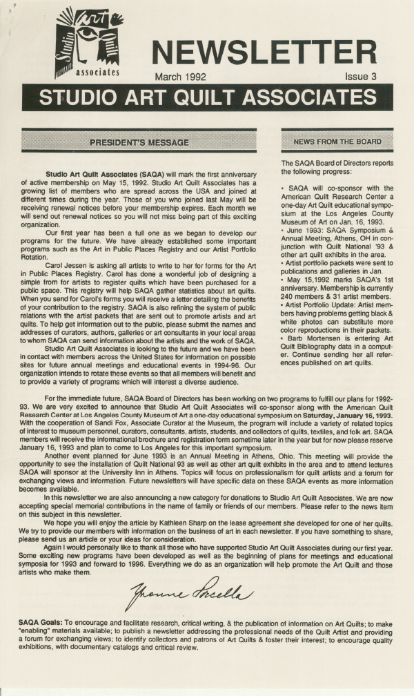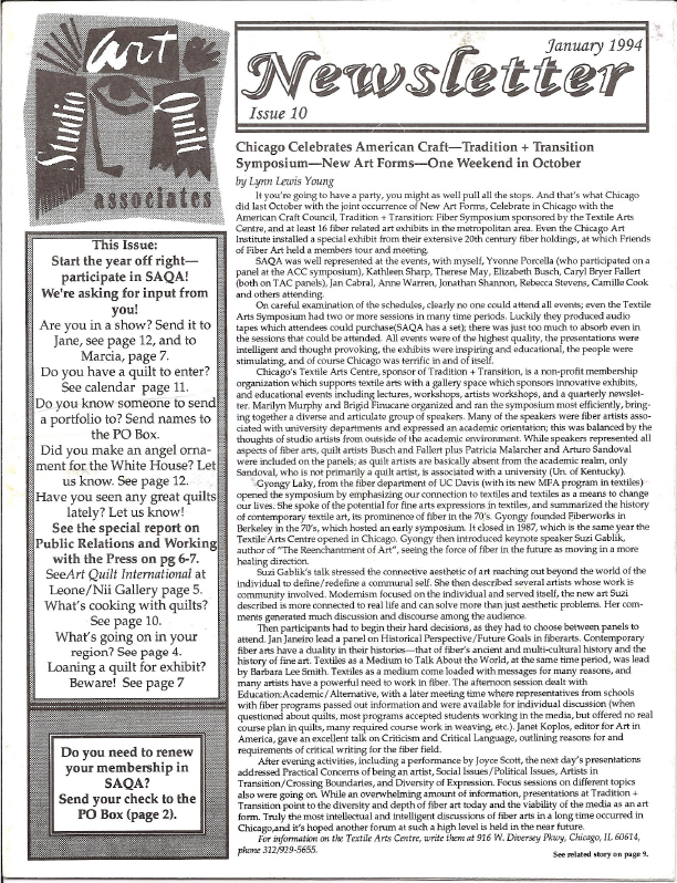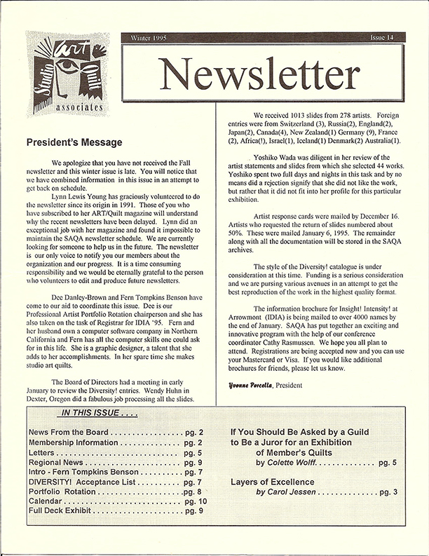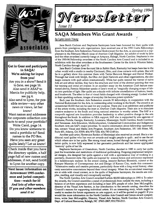 The SAQA Journal is published quarterly in full color. It is mailed to members and is also available online (the most recent issues are only available to current members).
