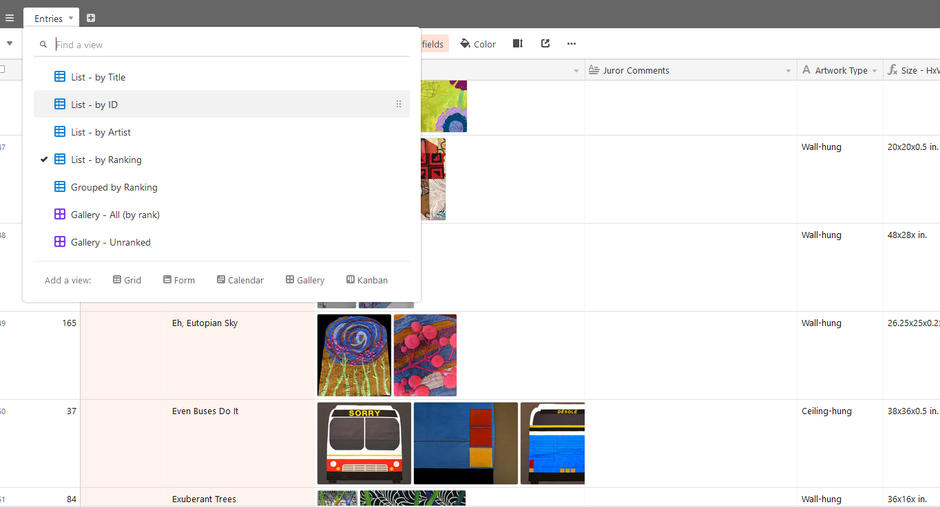 This option uses the same Formstack option included above plus an Airtable integraton. Airtable is a spreadsheet/database platform that allows for easier administration of entry information. This is handy if you expect a lot of entries (50+) and need to share information with venues, jurors, etc.