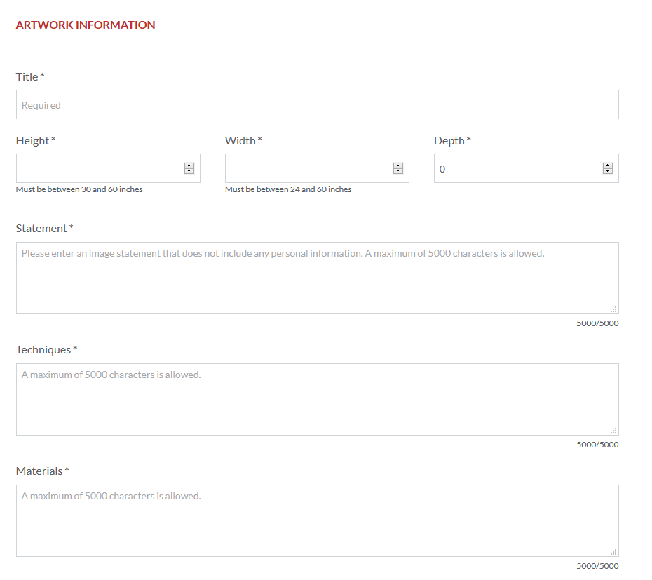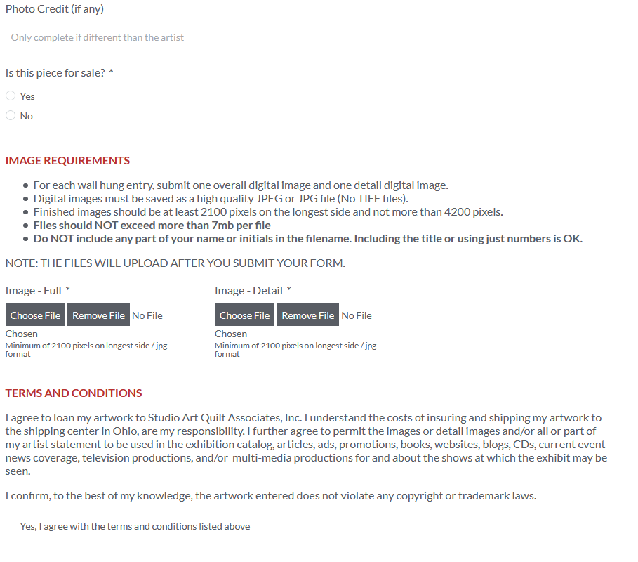Members will use this form to enter details about their submission and upload their images. This form will need to be completed for each piece submitted to the show. Some of the contact information fields will auto-fill (depends on browser settings for the user).