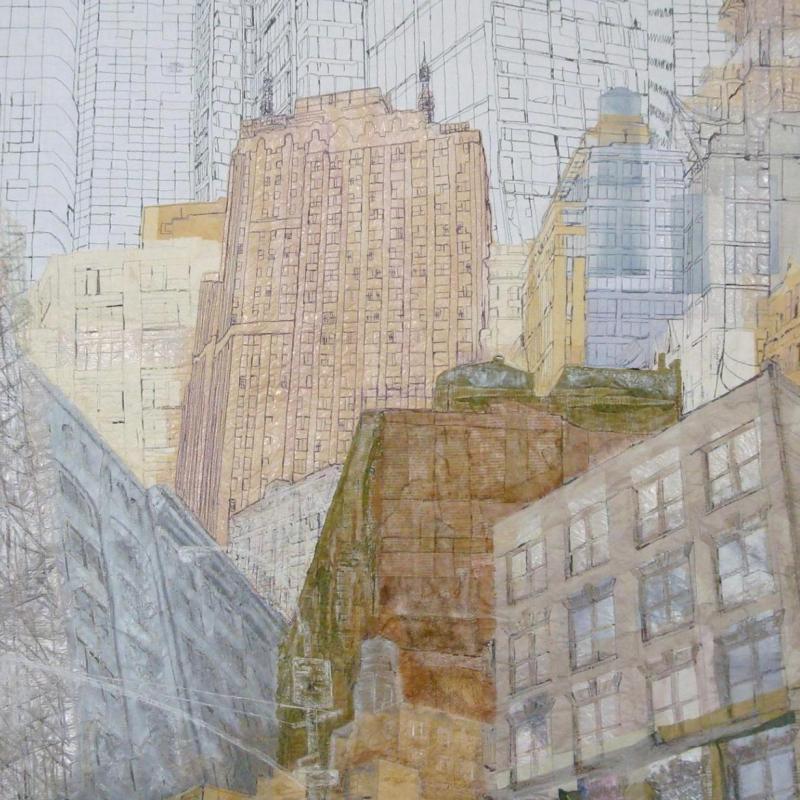 Formerly a painter, Sharon McCartney is full time artist who now works with mixed media to create her layered textile constructions. Sharon incorporates hand-stitching, found objects, and printed fabrics in her pieces.