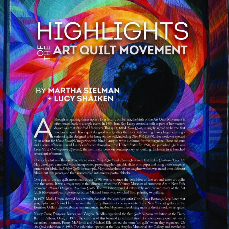 Martha Sielman and Lucy Shaiken take us through some noteworthy milestones in the Art Quilt Movement, from 1956 to today. This article was originally published on FiberArtNow.net