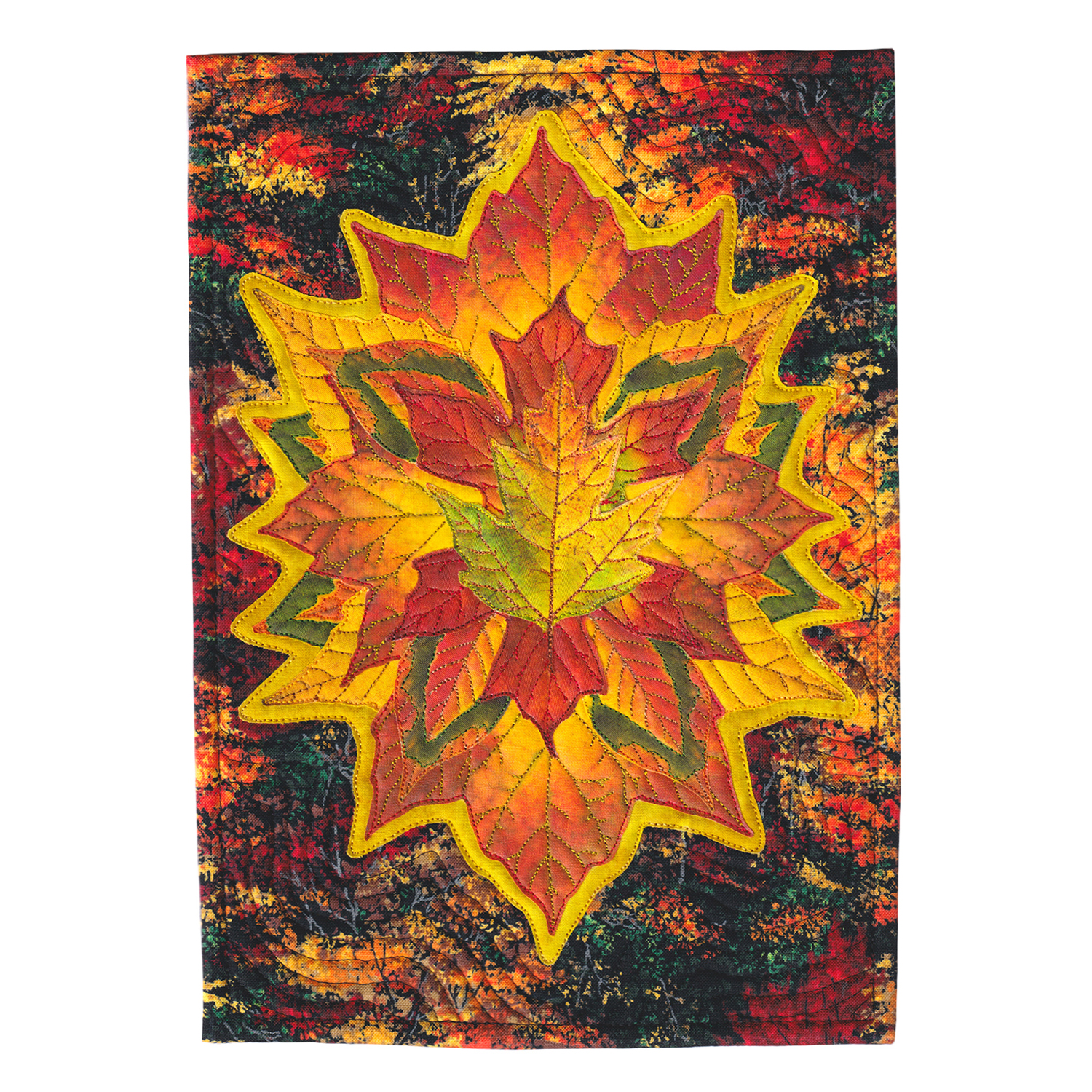Over the last several years I have enjoyed making fabric nature mandalas. I love photographing and printing leaves from my own environment, composing and stitching the prints into finished artwork. With Autumn Vibrations II, I wanted to challenge myself to step out of the traditional symmetrical circle and work with the rectangular requirement for the trunk show pieces.