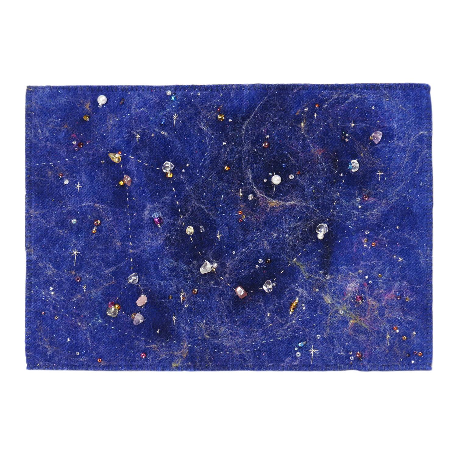 Draco—Latin for dragon—is one of the 48 Ptolemaic constellations described in the 2nd century. It can be seen year-round from northern latitudes. Despite its size, it’s not particularly prominent in the night sky. It does, however, encompass an amazing array of celestial objects, including many double stars, deep sky objects like the Cat’s Eye Nebula, Messier Object 102 (Spindle Galaxy), and several stars with exoplanets. This piece is my fanciful representation of the constellation and some of its denizens.