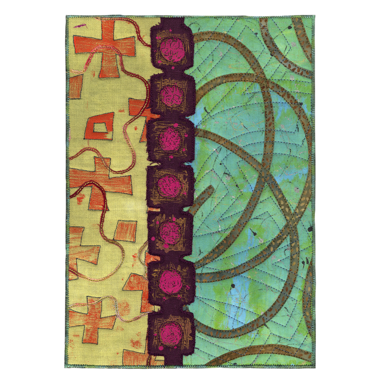Plastic bag printed, dyed, freehand drawn, reverse and raw edge appliquéd, machine stitched