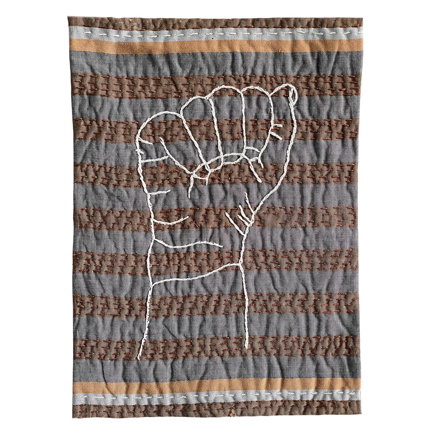 This quilt began as a sketch of my hand from an elementary drawing class. I created a background of kantha-style stitching, using a simple running stitch, on a handkerchief that had belonged to my uncle, and then stitched the design using back stitch. The piece became one block in a set of four that combined to form a vertical quilt that I entered in a show that required the quilts to be 48" by 12". For this trunk show, I removed this block from the original quilt and resized and refinished it.