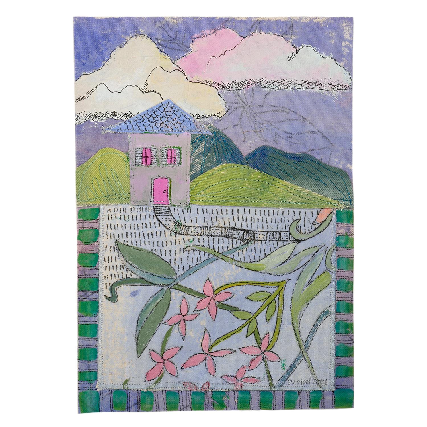 Dreaming of Home brings respite in the midst of the pandemic. With borders closed and a deep sense of unknown, the world has grown from small and connected to extremely large. Travel plans, homecomings, and visitors are all on hold. I chose to use colors that feel calm and create a warm environment in which the house sits. The house, childlike in its simplicity, sits peacefully in the hills. Underneath, a large flowering weed balances the composition. In my work, weeds symbolize strength. This year we have all needed collective strength to get through the pandemic. Dreaming of Home is a visual place to rest and imagine and feel at peace. It is a visual homecoming of a place so many of us are dreaming and longing for; home.
