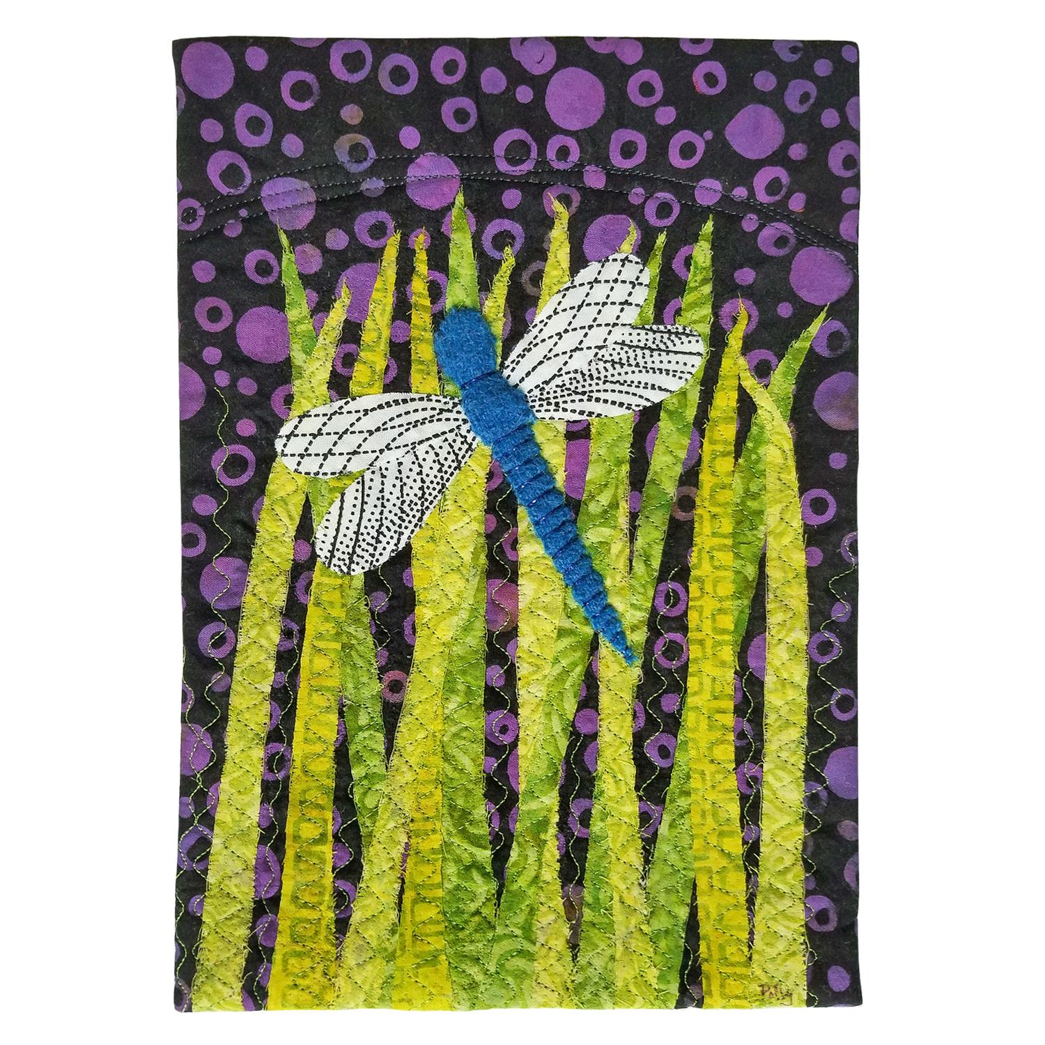 When creating the reeds in "Enjoy a Good Reed," I used no fusible to attach the reeds after freeform cutting them with my rotary cutter. I used my needle felting machine to attach them to the background and batting. I love how this process distresses the batiks to add a more organic look to them. I then used an embellishing stitch from my machine for my quilting stitches. I love how these embellishing stitches add movement to the piece. I did use some fusible on the dragonfly wings since the fusible helps in hiding the shadowing that can occur from the fabrics behind the white of the wings. Hand appliqué was used on the wings and the body. I just thought the dragonfly needed a bit of sparkle so metallic thread was used. I then applied a diluted 50/50 mixture of water and matte medium over the reeds to keep the reeds from fraying further.