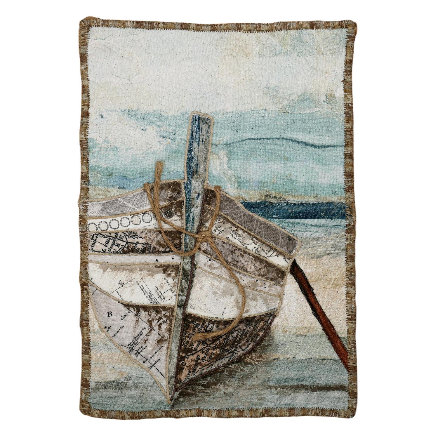 A perfect day on the beach is either off exploring or wandering with my camera and coming across a boat tethered and resting in the cool damp sand for its captain to come back take it for yet another wave-tossed spin in the water. Excitement flutters through my soul exploring all the dings to the boat and imagining how they got there...what is the story behind this adventure? The sky depicts a slight breeze and the cool turquoise colors lend to the feeling of a pleasant day to wander a bit more. Then the thought, can I pull off a re-creation of this photo in cloth? So I take mental notes as to my surroundings to assist in the re-creation. A perfect end to a day at the beach is to stretch the exploration even further and pull off not just a new art quilt, but portray and share a feeling to the viewer that I experienced. Voila, Thank you for joining my day "Off Exploring" at the beach.