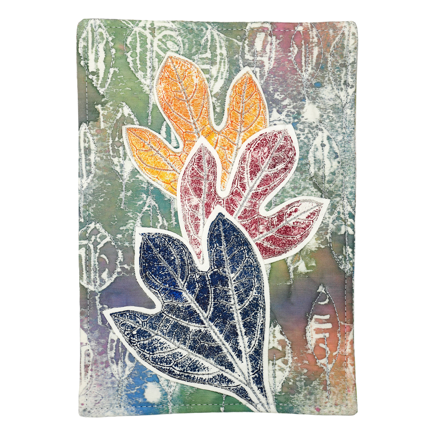 Cotton, fabric paint, stencils, leaves, stabilizer, thread