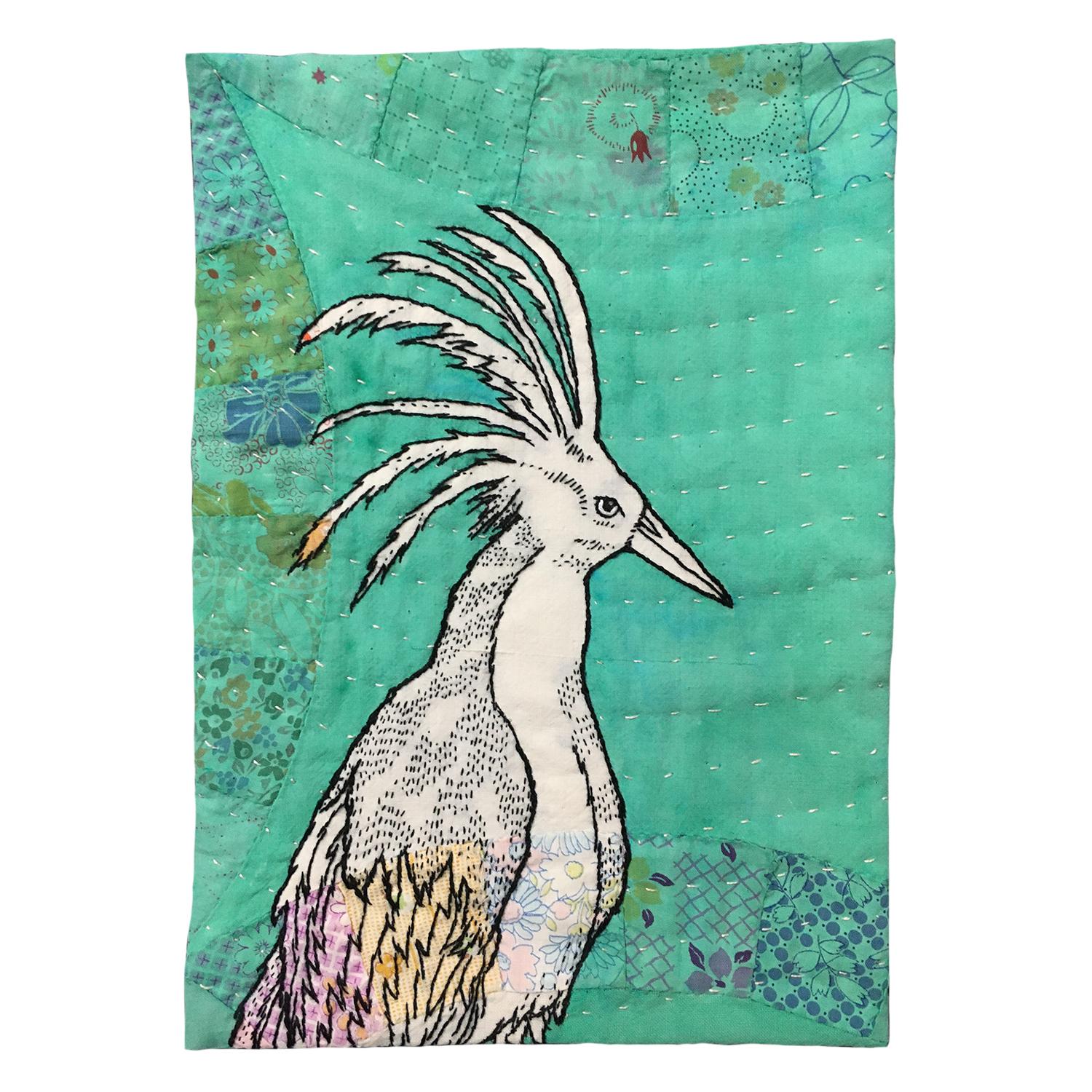 Little Kagu depicts a sweet little bird from New Caledonia that is very endangered. He is hand-embroidered on a vintage quilt top that was made in the 1940s or earlier. The fragility of vintage quilts, and the fact that when this quilt was made the Kagu population was in better shape, speaks to their current plight.