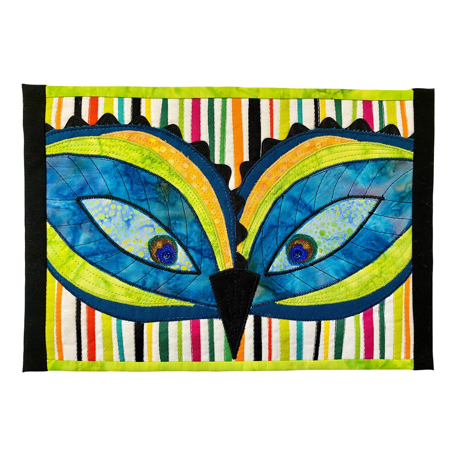 “Midnight Masquerade” is peering in to see when the fun will begin! She is full of whimsy and color. I enjoy working with colorful fabrics and a variety of prints that help to create a whimsical outcome. In this piece the background stripes and rick rack help to add to the whimsy with their playful features and stripes of color.