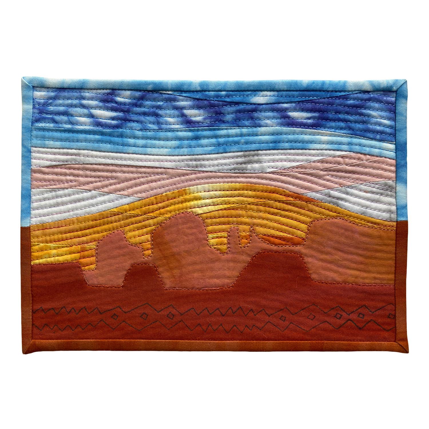 As a quilter creating contemporary art, I am inspired by the natural world near my home in northern Arizona and during my travels in the western United States. My work is related to nature and landscapes through color, pattern, and design. I experiment with color, print, and dyed fabric, and develop texture through various surface design techniques. Images of forests, deserts, and grasslands, the folds and textures of geology, and the impressions and traces of wildlife are common themes I work with in many of my quilts. My quilts are the stories of what I have seen and experienced through my daily walks or my travels.