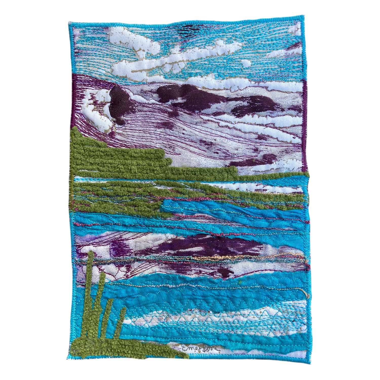 Landscapes have often been the subject of my Plein Air watercolors and oils. So in my mind’s eye, I could see the mountains and clouds in the mono-printed fabric. Belonging to SAQA has gifted me with great friends and new materials in which to create art. I recommend everyone to join SAQA.