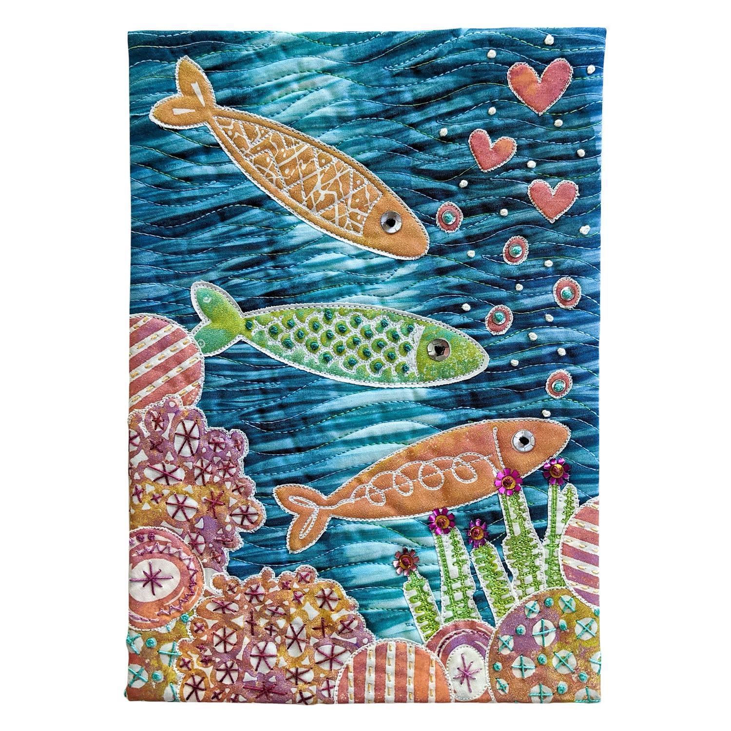 Cotton, fusible web, stamps, acrylic paints, embroidery floss, sequins