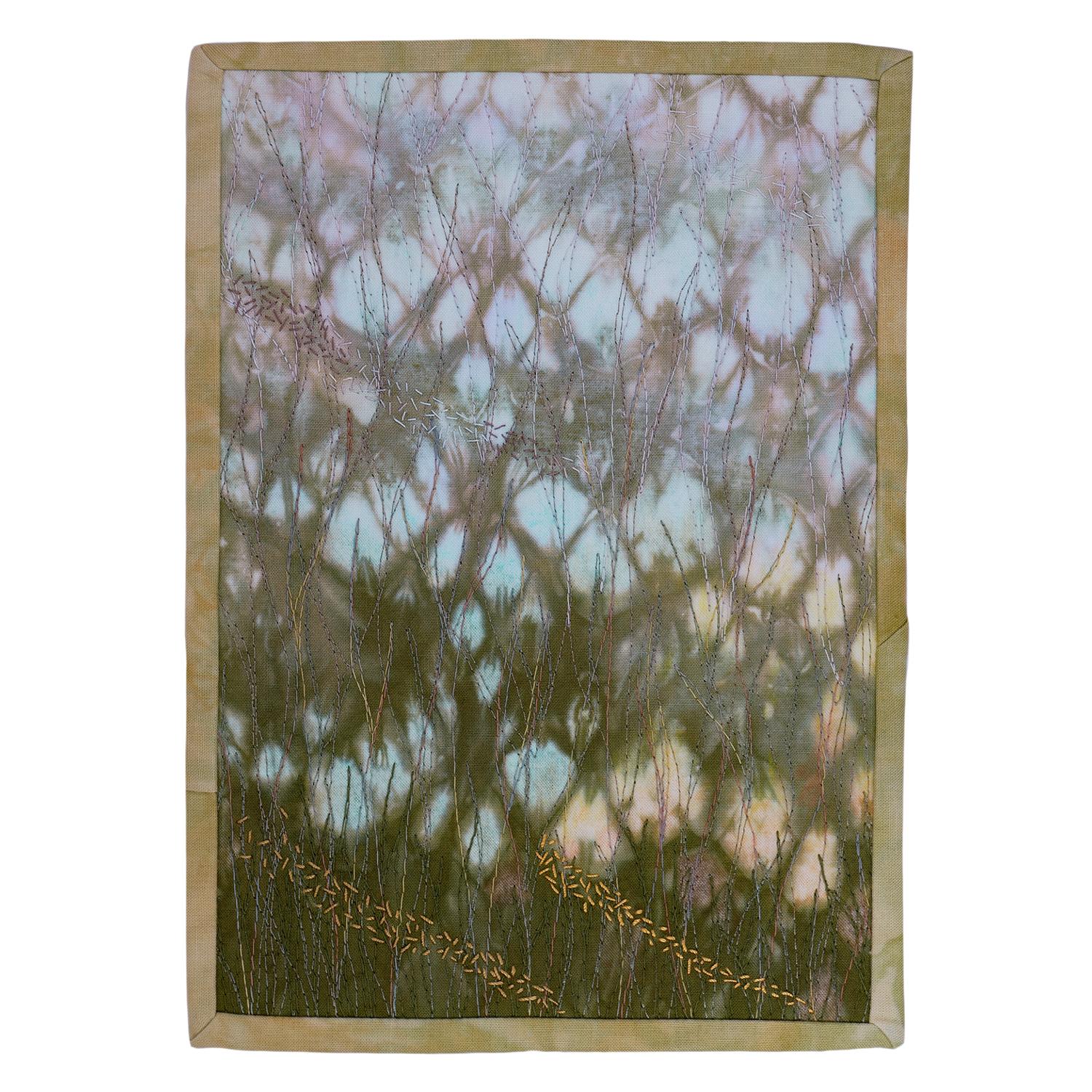 Hand-dyed fabrics, colored pencils, thread