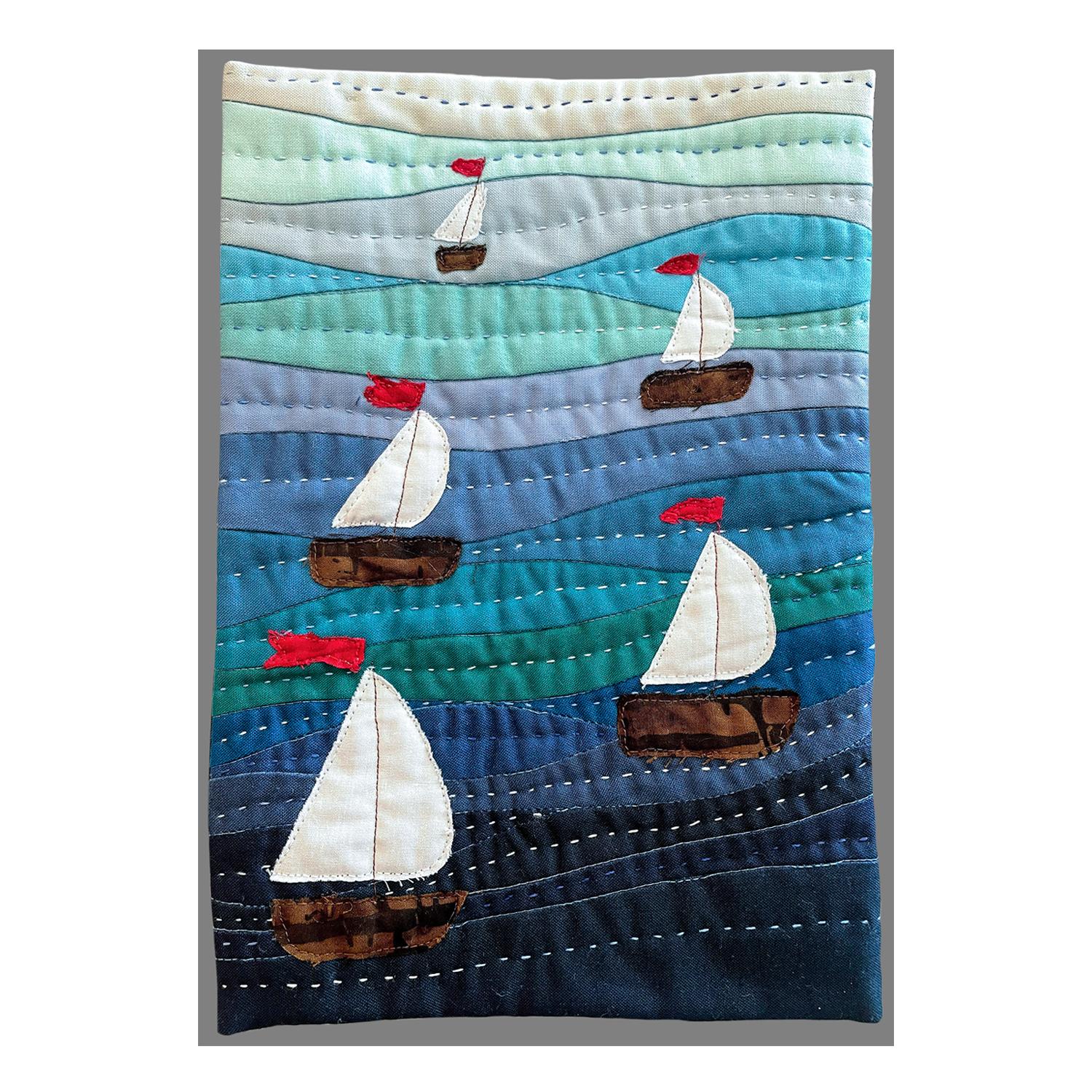 This project is the result of a watercolor painting class exercise—to be inspired by the work of another artist. I chose to work with a piece by Patrick Lynch, entitled "Wooden Sailboats." After making three paintings, with each stepping away from his style into my own, I decided to try it in fabric. I used curved piecing, free motion quilting, free-form appliqué, and hand quilting. The water in the background is all improv cut and pieced curves. The sailboats are free-hand cut from quilting fabrics. I prefer not to use interfacing or fusible for my appliqué—the stitching experience is better without fusible products, and I enjoy the small amount of texture provided by the unravelling edges of the fabrics.
