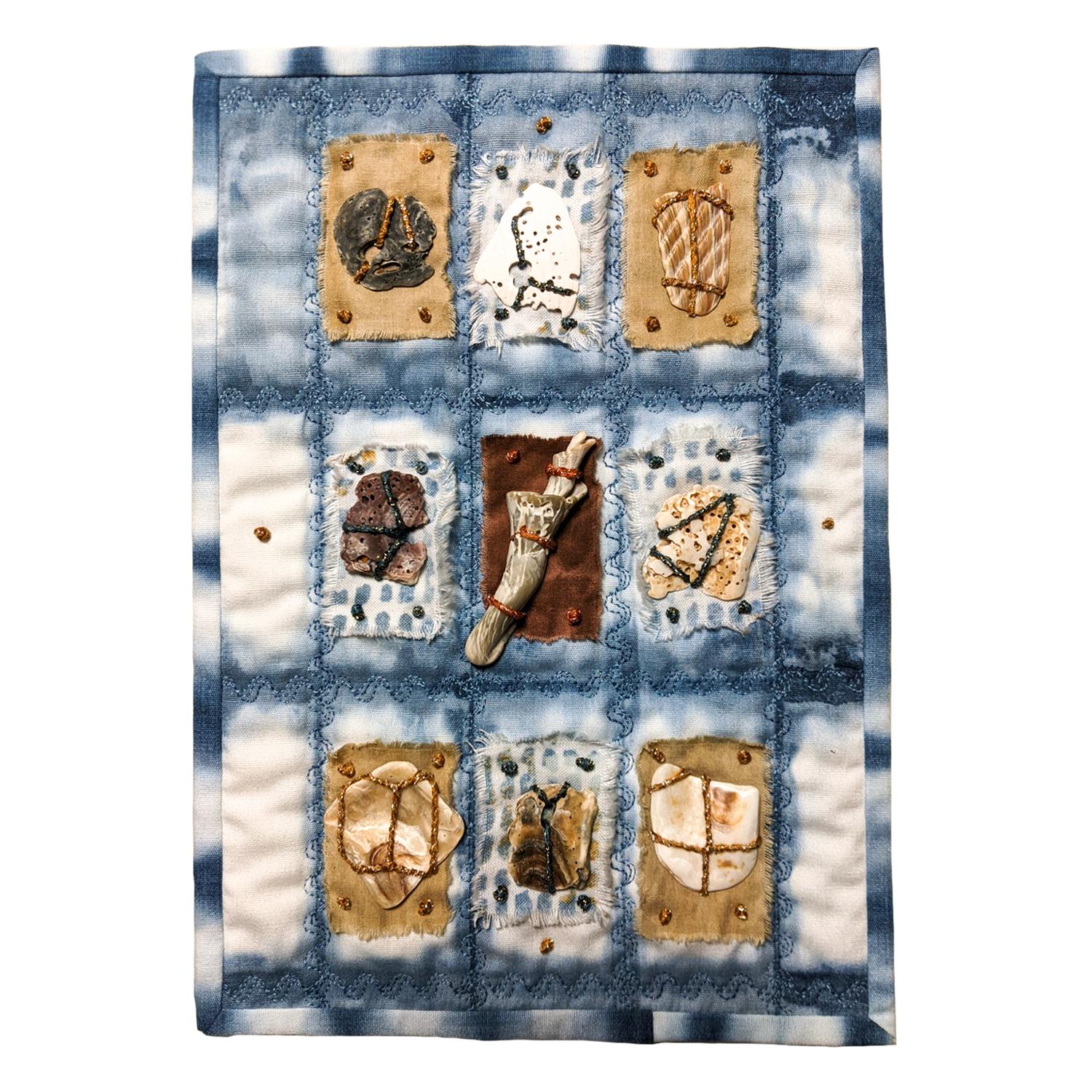 Weathered shells, cotton, muslin, embroidery floss, stabilizer, batting