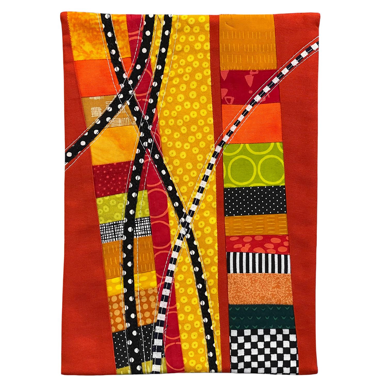 I love bright colors mixed with black and white. Improvisational piecing is my favorite technique. Sidewalks & Pathways combines both. When I begin a new piece, I never know quite where it will lead. While garden paths and walking trails were my initial inspiration, serendipity played a role too. Finding the bias strips with fusible web already attached added the finishing touch. After all, we can't always stay on the straight and narrow.