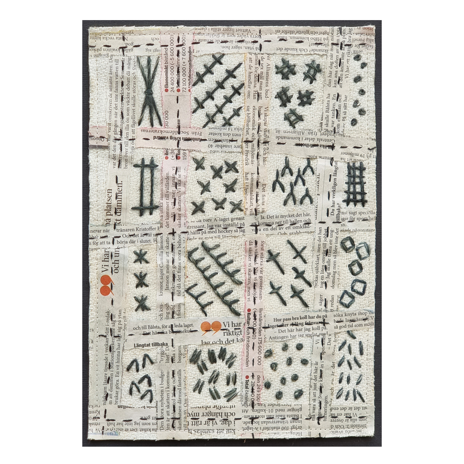 Ancient handwoven and farmed linen, newspaper, matte medium, embroidery thread, cotton