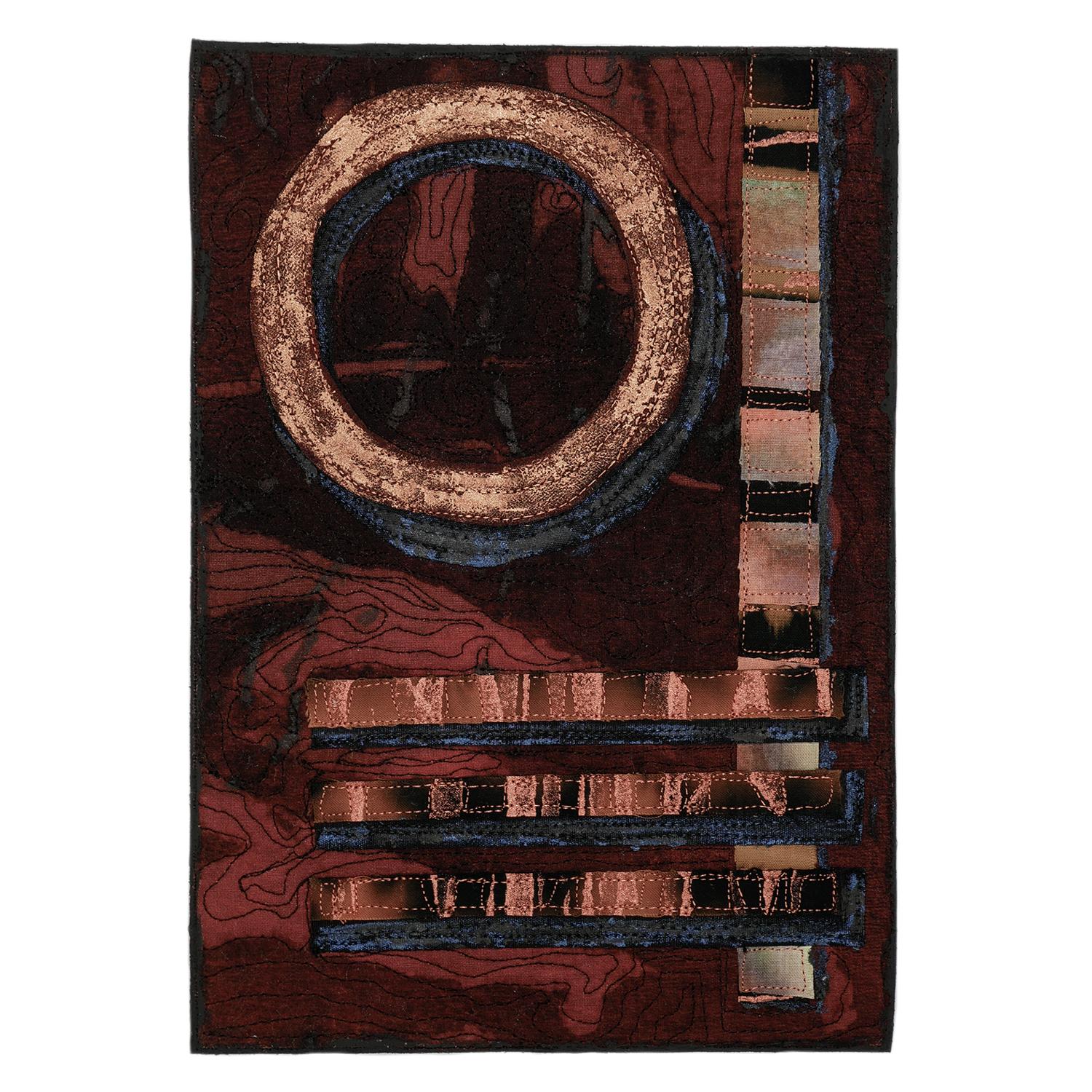 This is a collage of fabric pieces. I enjoy experimenting in my studio. Sometimes things work, sometimes they don't, but don't ever throw anything away because it may be used in a way that you haven't discovered yet. The underlying fabric of this piece is a black fabric that has been discharged. I layered it with a silk chiffon scarf that I painted with black and orange metallic paint. Bleached and painted fabrics are what consist of the small pieces layered on top of the silk scarf. I like to stitch the edges of my quilt and then paint them so they don't fray.