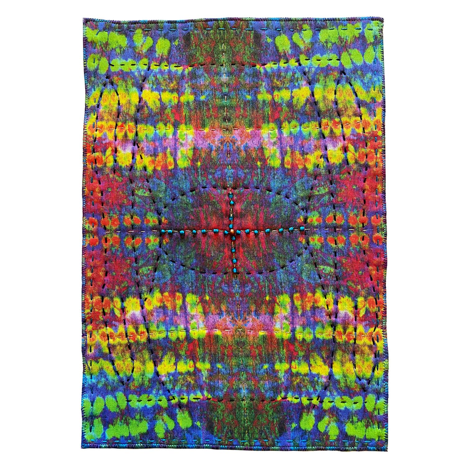 Digitally manipulated, scanned, shibori stitched, dyed, printed, hand stitched, embellished, zig zag stitched